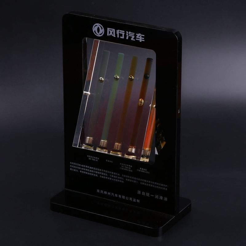 產品描述:亞克力機油展示架,采用透光性高達96%的亞克力為原材料,清晰、透亮,顧客通過內置的鐵球,能夠清晰直觀的觀察機油色澤以及潤滑程度,我們也可以為您定制各類的形狀以及圖案(Logo、二維碼等),向客戶全方位的展示您的公司或個人信息。